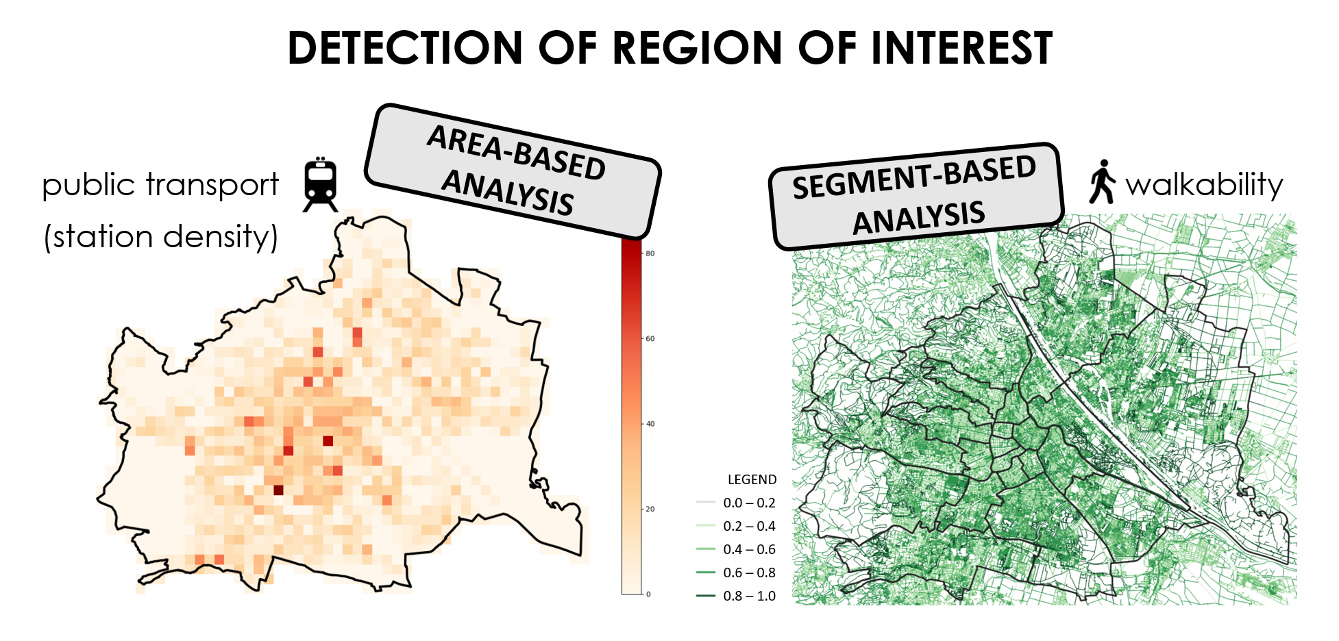 The Detection of Region of Interest algorithm identifies areas that perform worse than others and may benefit from targeted improvements. It analyzes individual segments – considering factors like walkability and bikeability through metrics such as gradient, infrastructure, or green space – as well as aggregated areas, highlighting patterns like station density or access to key services. Metrics can be combined into customizable indices with flexible weighting, to pinpoint regions most in need of intervention or further study.