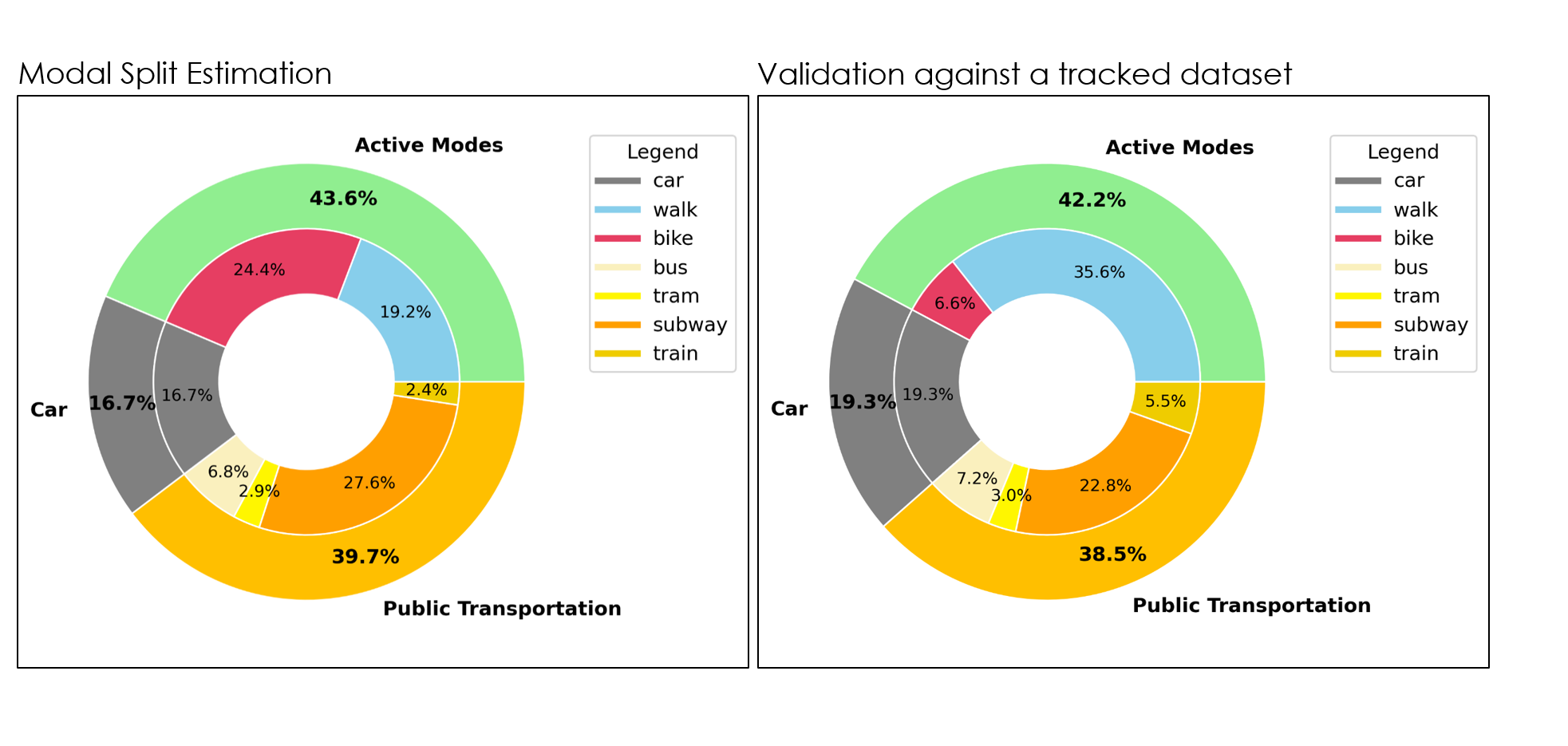 The Modal Split Estimation predicts by which means of transport people move across a city by combining algorithmic fastest-route calculations with human travel preferences. Using a multimodal transportation network, it estimates the share of trips by car, active modes like walking and cycling, and public transport, even breaking down individual transit types. Validation against official city data shows high accuracy, with deviations under 1.7%, and the approach provides detailed insights that go beyond aggregated statistics.