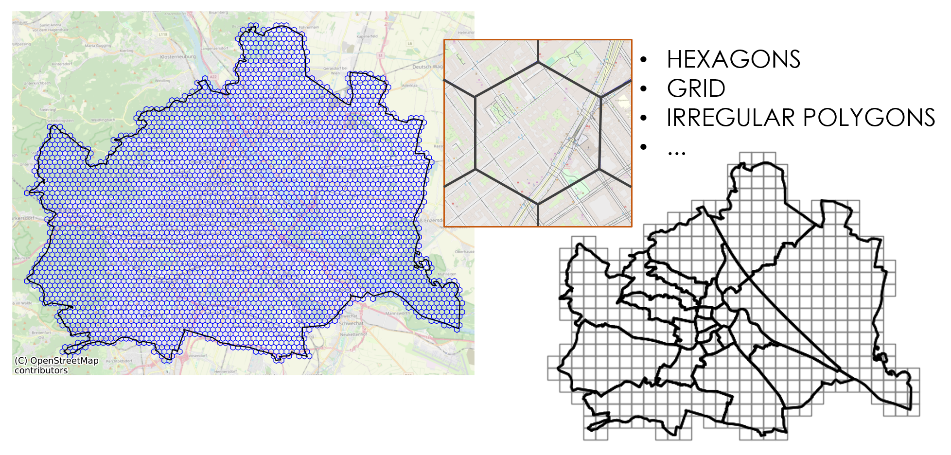The Segmentation of Space module divides any geographic area into flexible spatial units tailored to the research question. It can generate hexagons or regular grids of varying sizes, as well as divide the area into irregular polygons, allowing analyses at different spatial resolutions. This adaptability enables consistent comparisons across studies and supports customized investigations of urban patterns and mobility dynamics.